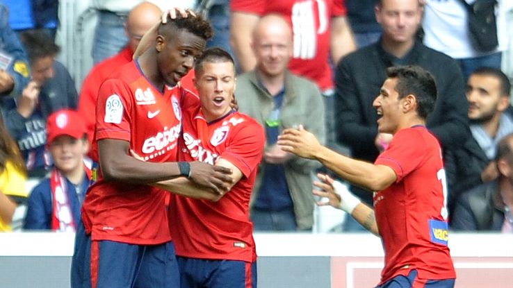 Divock Origi is congratulated by his teammates after netting the opener for Lille.