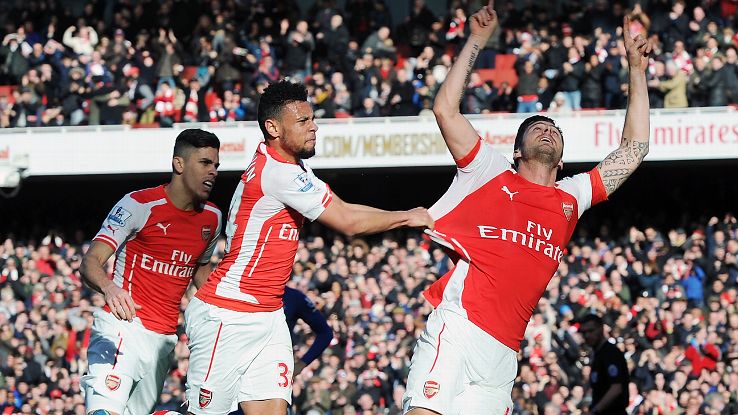Olivier Giroud, who missed several chances as the Gunners slumped to a 3-1 home defeat by Monaco in the first leg of their Champions League last-16 clash on Wednesday, netted a fine volley on 39 minutes to put Arsenal ahead on Sunday.